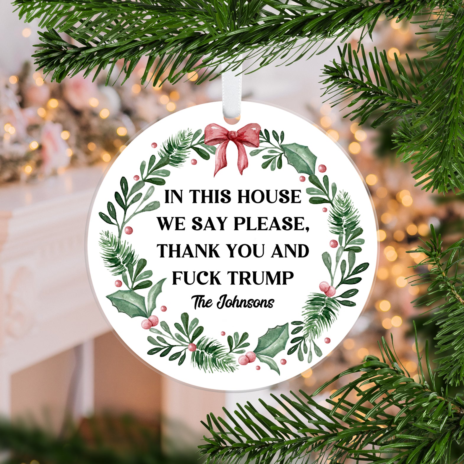 🎄Funny Political Christmas Ornament – “In This House We Say Please, Thank You, and Fuck Trump” – Personalized Holiday Decor** 🎄